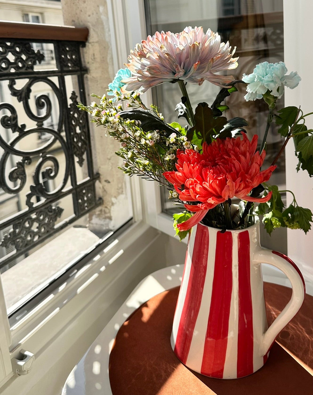 Avec ses rayures rouges peintes à la main, ce pichet apporte une touche graphique et artisanale à votre intérieur. Qu’il soit utilisé comme vase, carafe ou simplement en objet décoratif, il attire le regard avec justesse, sans jamais en faire trop.