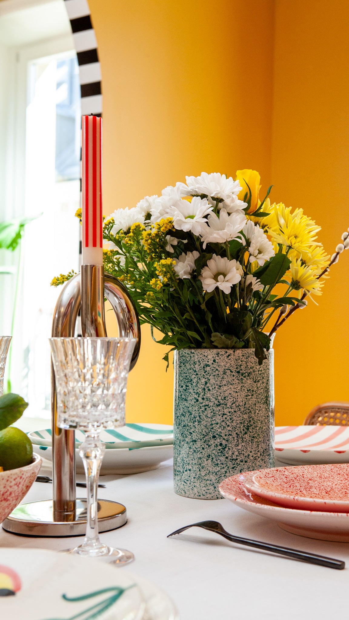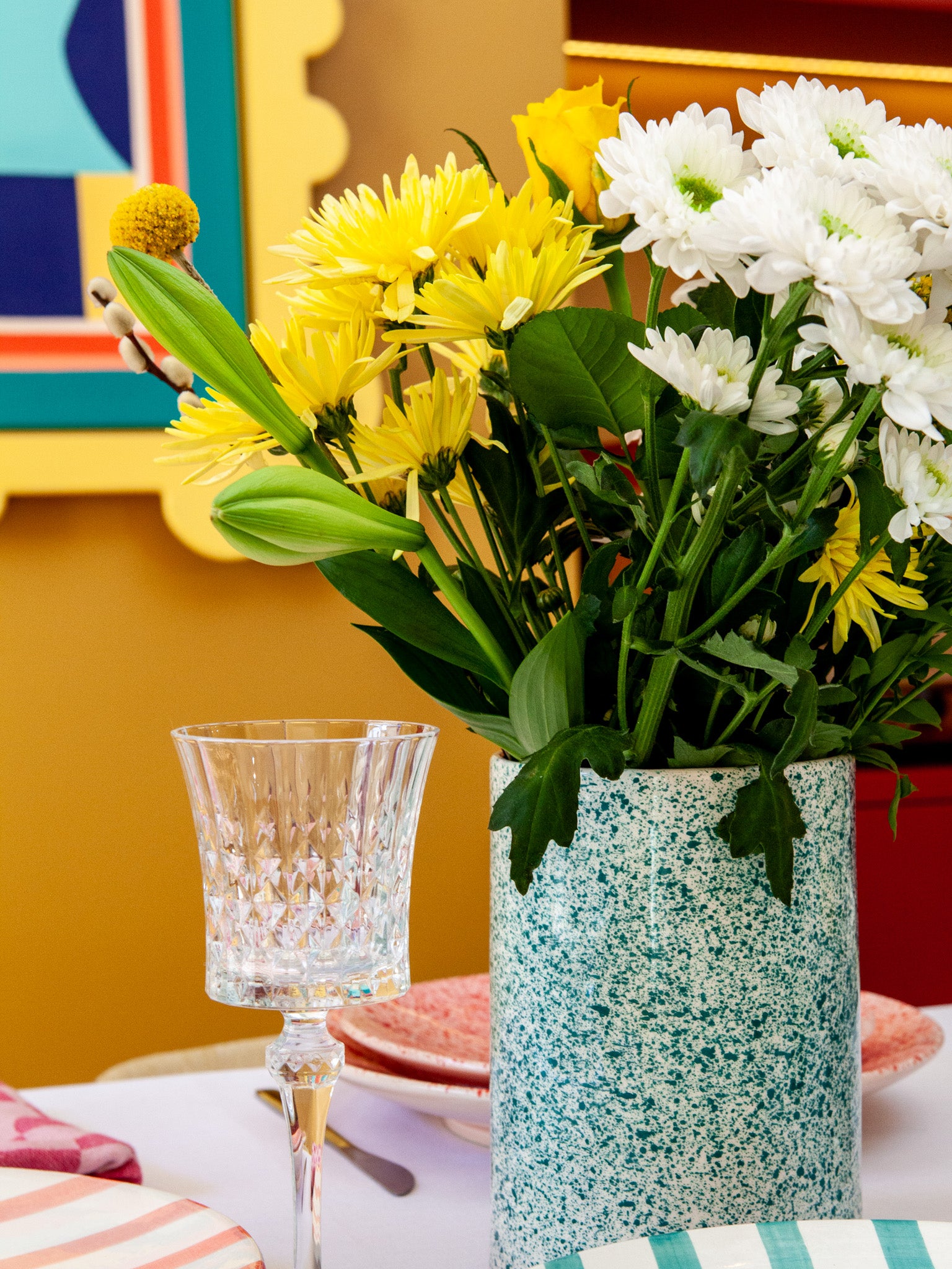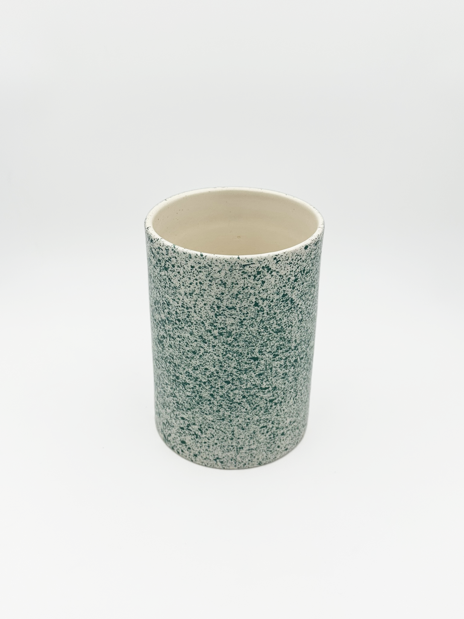 Ce pot à ustensiles aux tâches vertes apporte une touche vivante et artisanale à votre cuisine. Utilisé pour ranger vos couverts, vos ustensiles en bois ou même en vase détourné, il illumine l’espace par son motif vibrant et sa texture brute, pleine de caractère