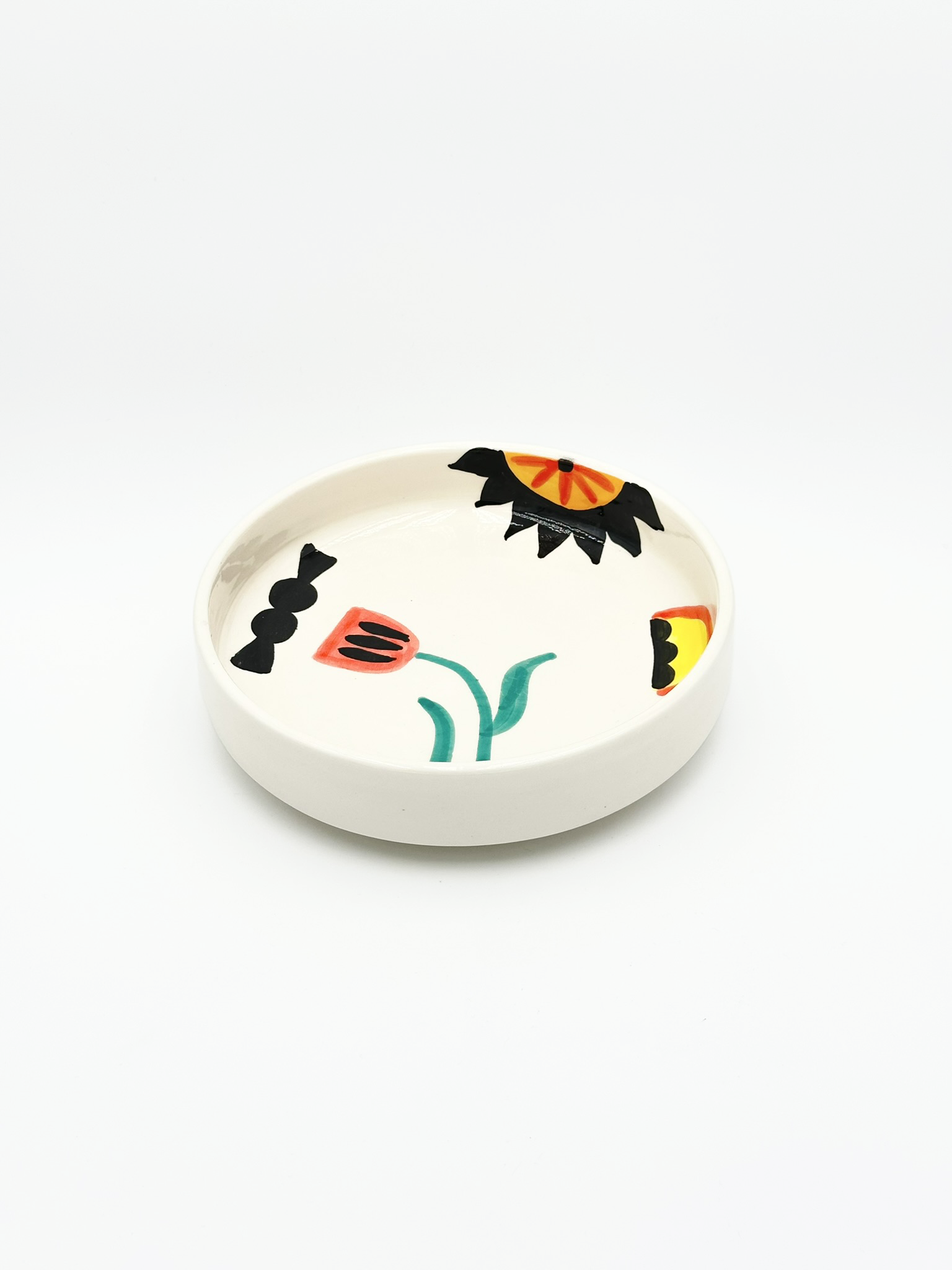 Une pièce expressive et artisanale. Cette assiette creuse est décorée à la main de motifs floraux et graphiques, dont notre tulipe stylisée. Les couleurs franches, appliquées une à une, donnent vie à une composition unique à chaque exemplaire.